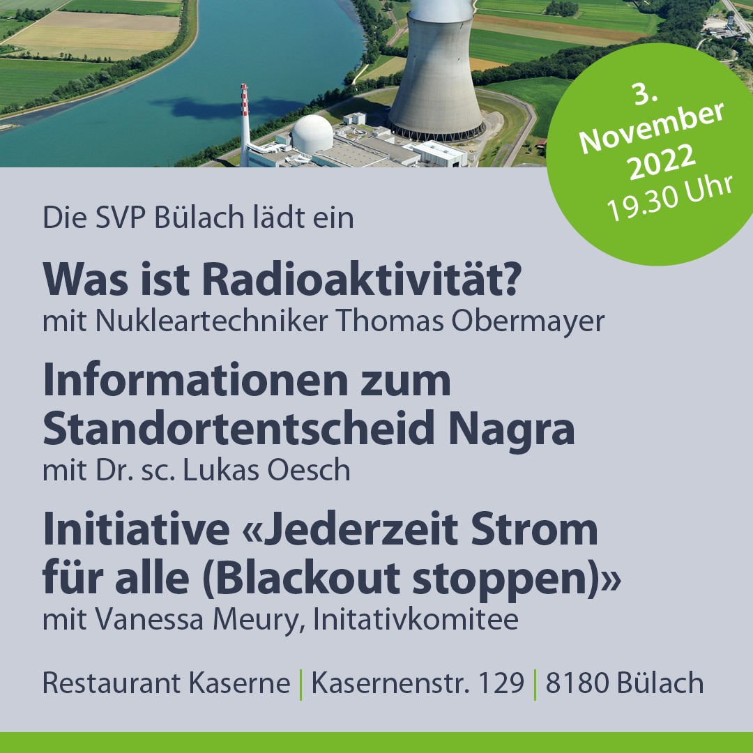 mit Nukleartechniker Thomas Obermayer Informationen zum Standortentscheid Nagra mit Dr. sc. Lukas Oesch Initiative „Jederzeit Strom für alle (Blackout stoppen)“ mit Vanessa Meury, Initiativkomitee Eintritt frei